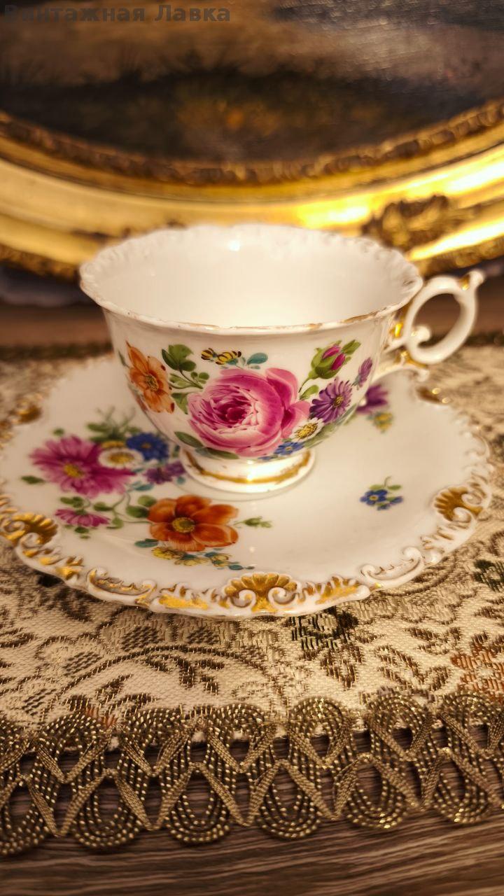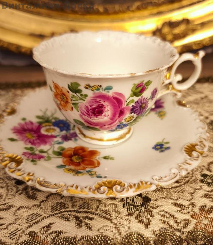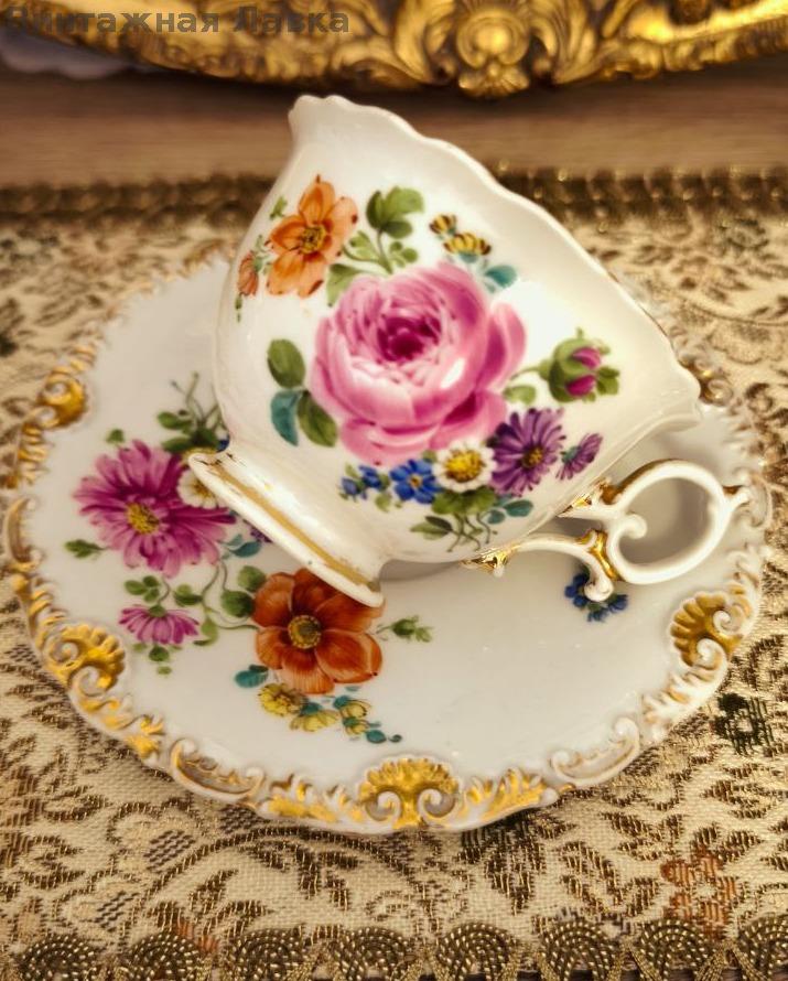 Ручная роспись крупными садовыми цветами: насыщенные розы, яркие астры, васильки, мелкие голубые бутоны. Мягкие переходы оттенков, живая “натуральная” манера — типичный стиль Meissen до середины века.