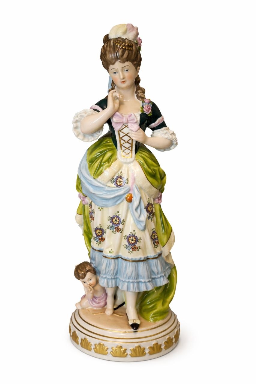Фигурка представляет собой утончённый сюжет с дамой и путти — не типичная для массового рынка вариация, которая практически не встречается в свободной продаже, особенно в подобной сохранности.