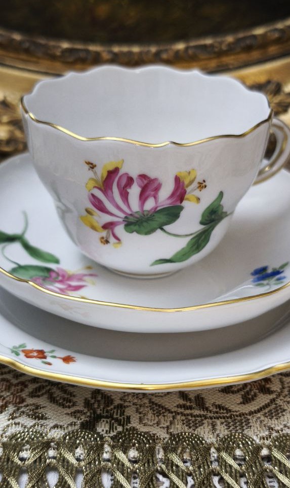 Это классический мотив для фарфора XVIII–XIX века: жимолость любили за аромат, нежность и символику привязанности. Такой цветок часто рисовали на чашках именно как «цветок уюта».