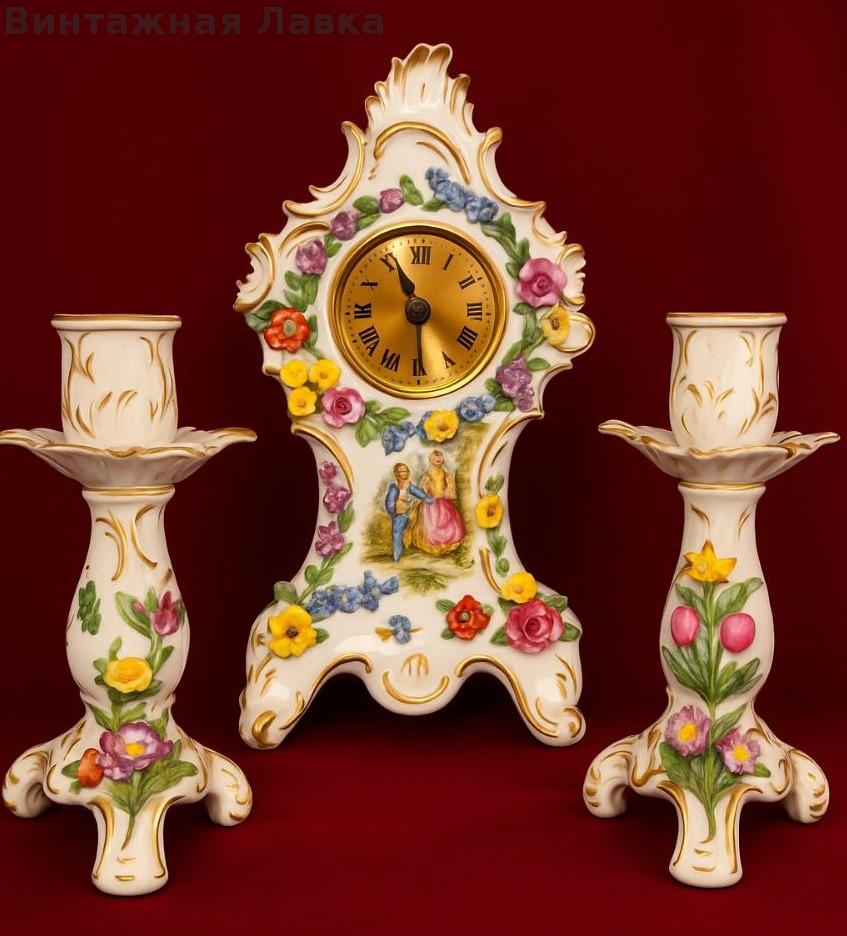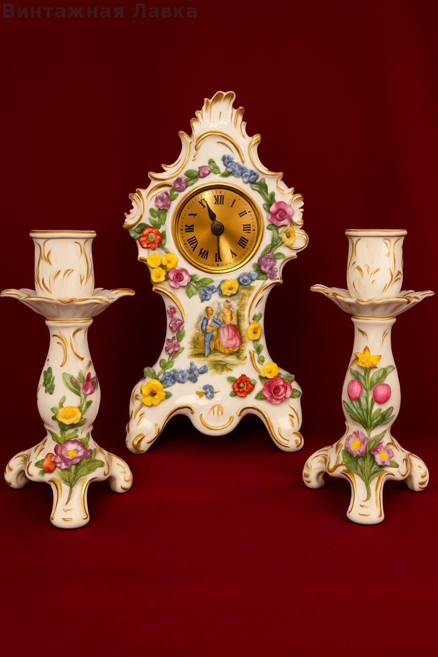 Комплект состоит из настольных часов и двух подсвечников.
