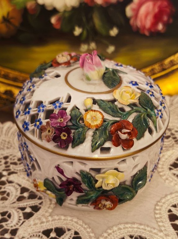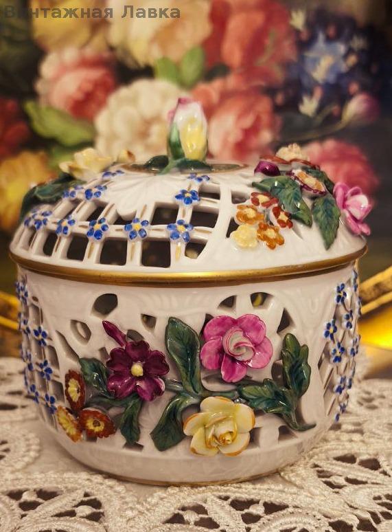 Изысканная фарфоровая шкатулка, произведённая на Дрезденской фарфоровой мануфактуре, с последующей художественной отделкой в мастерской.