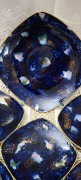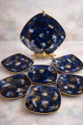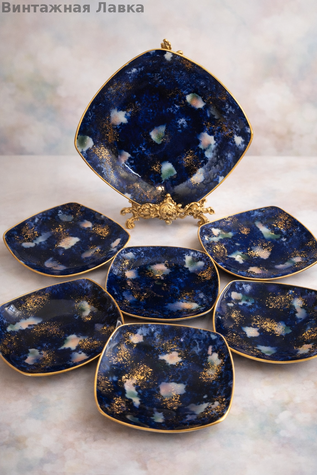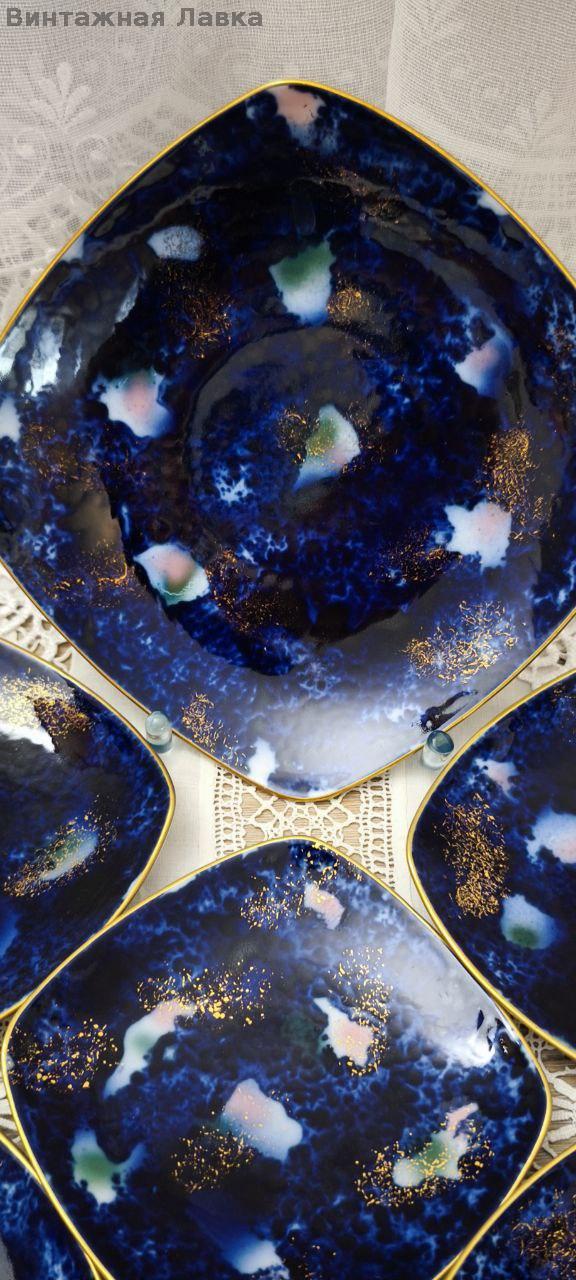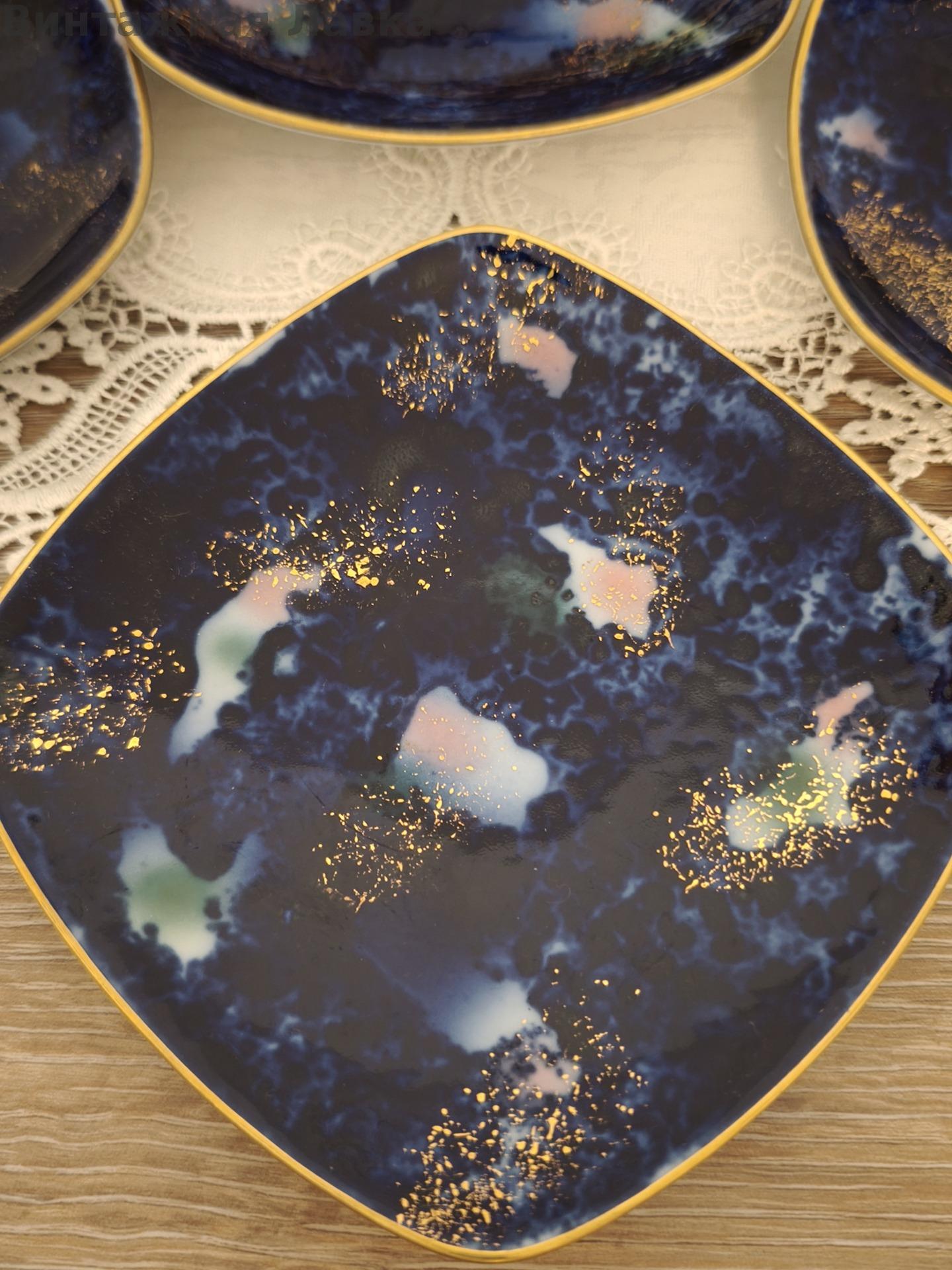 Фарфор глубокого кобальтового оттенка с художественным эффектом «звёздного неба»: живописные светлые облачные вкрапления и щедрое золочение создают впечатление космической глубины.