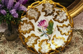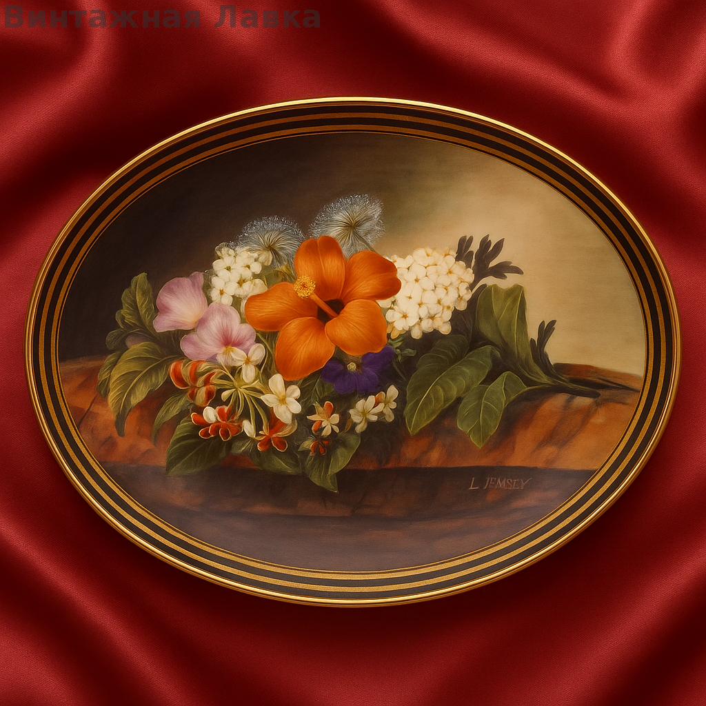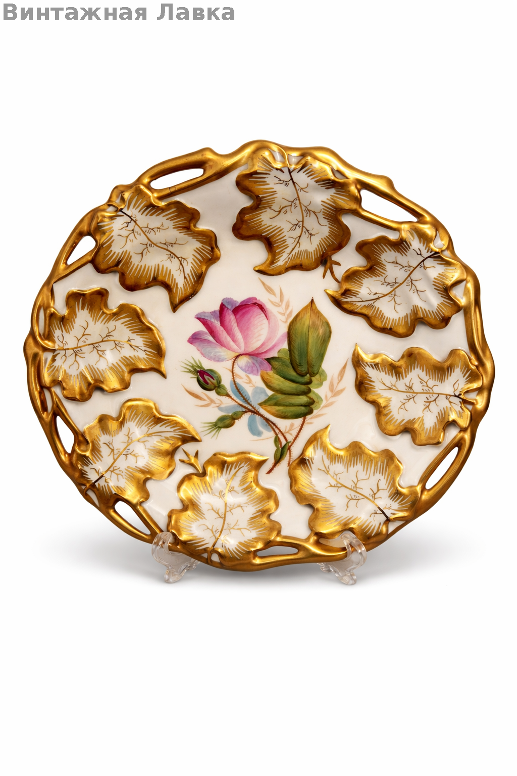 Рельефный борт в виде листьев, золото глубокое и тёплое, в центре — нежный цветок, выполненный кистью, не деколь.