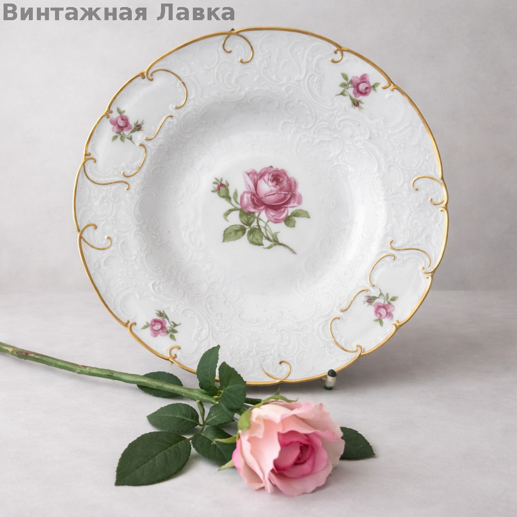 Рельефный край с деликатным золочением придаёт форме глубину и лёгкий барочный характер.