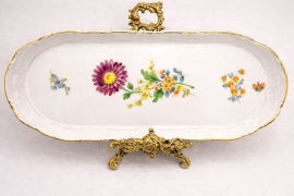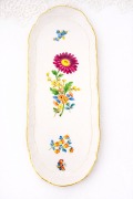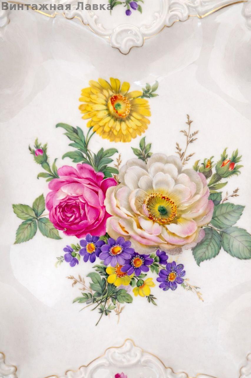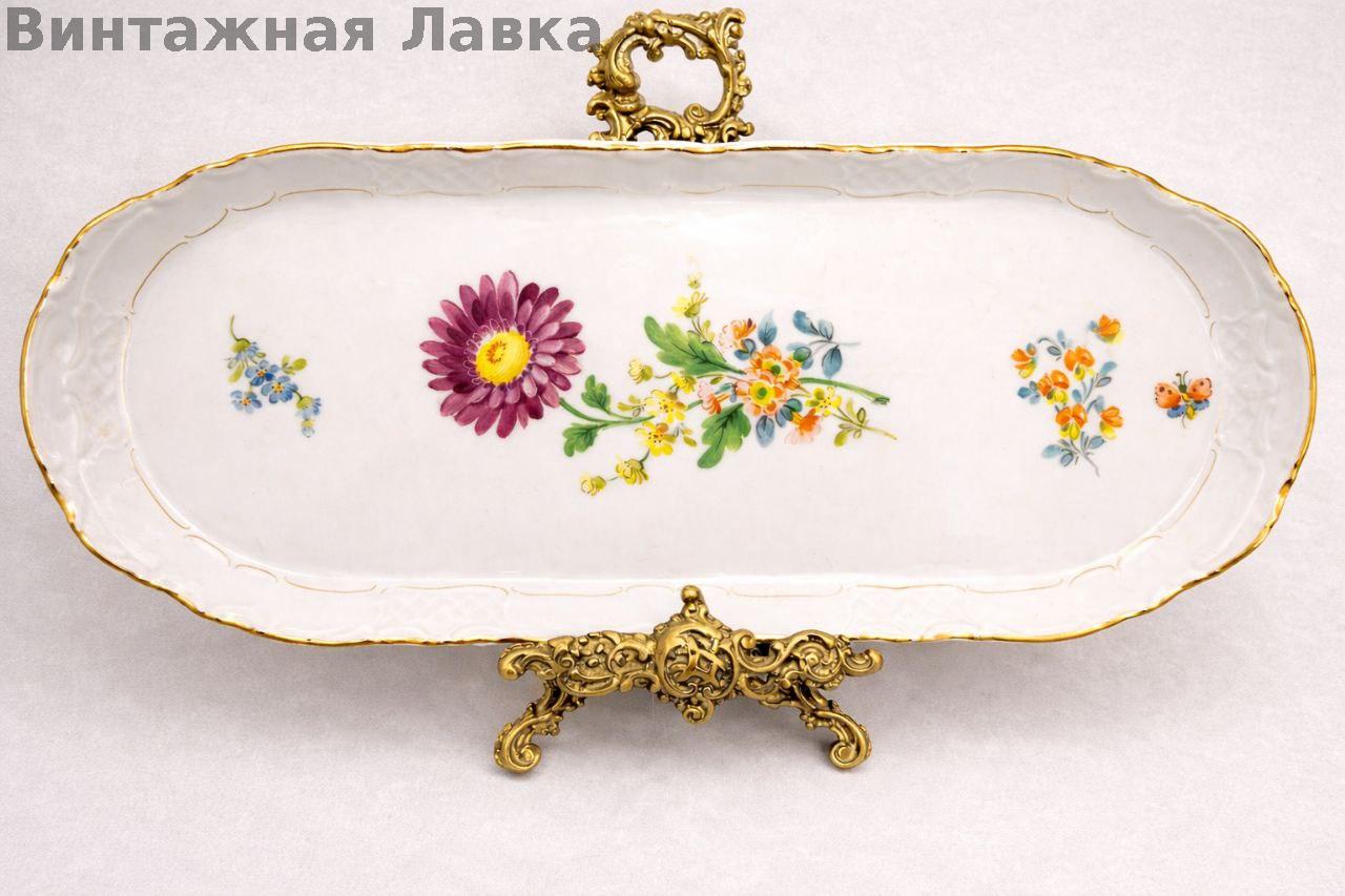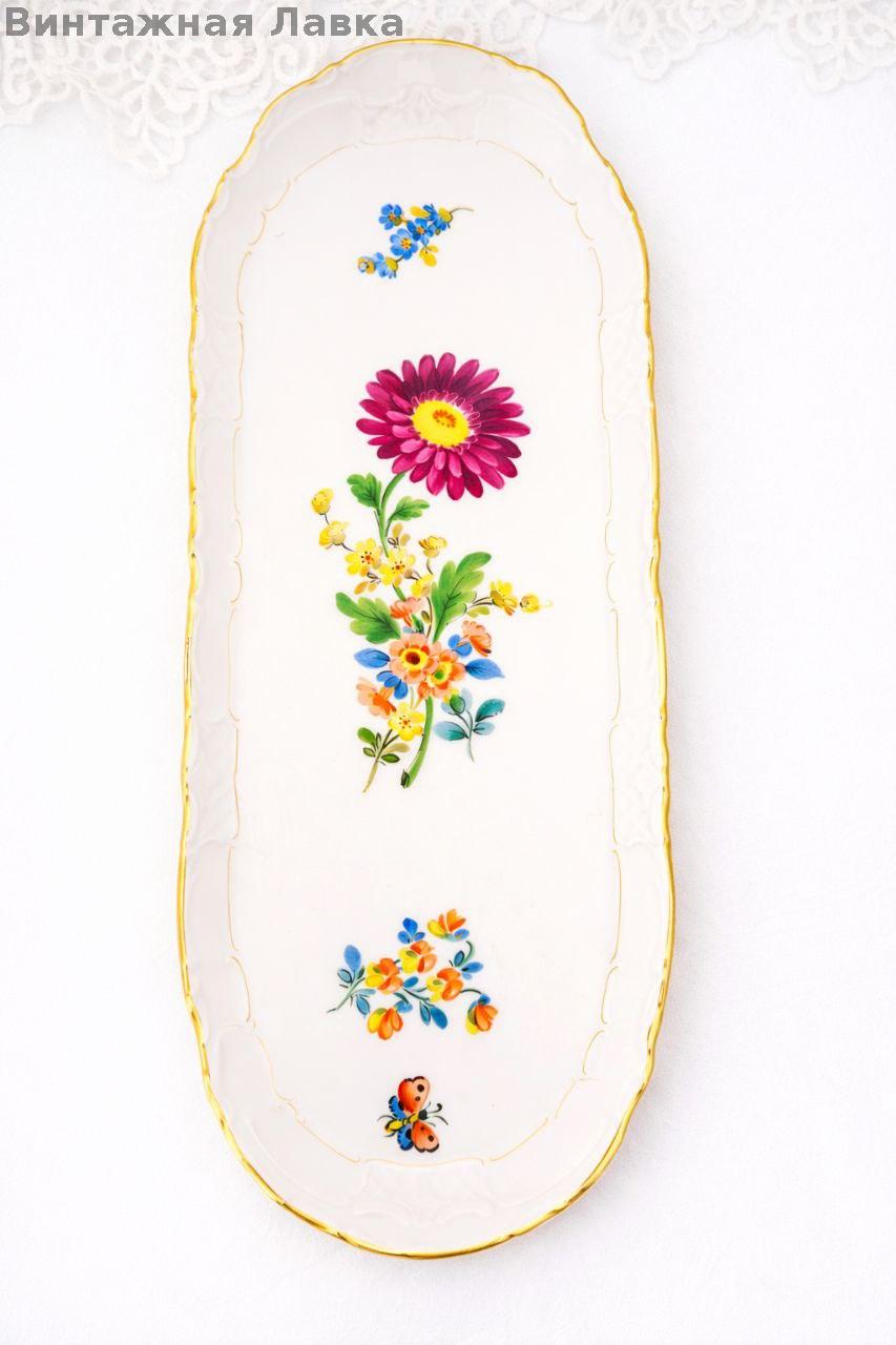 Изящная вытянутая форма с волнистым бортом украшена цветочной композицией с бабочкой — типичный «дрезденский сад».