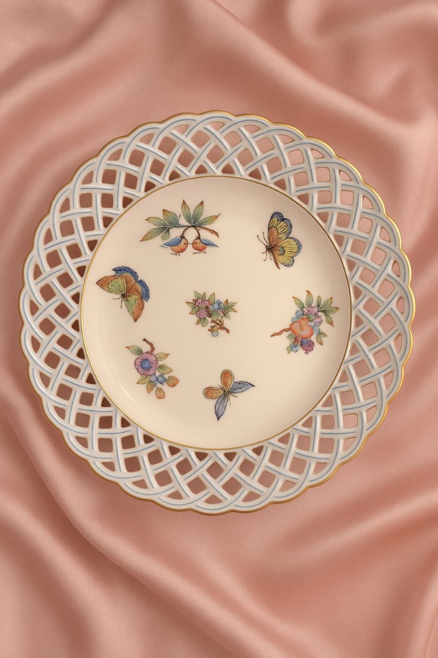 Белоснежный фарфор с изящным прорезным узором и золотым кантом.