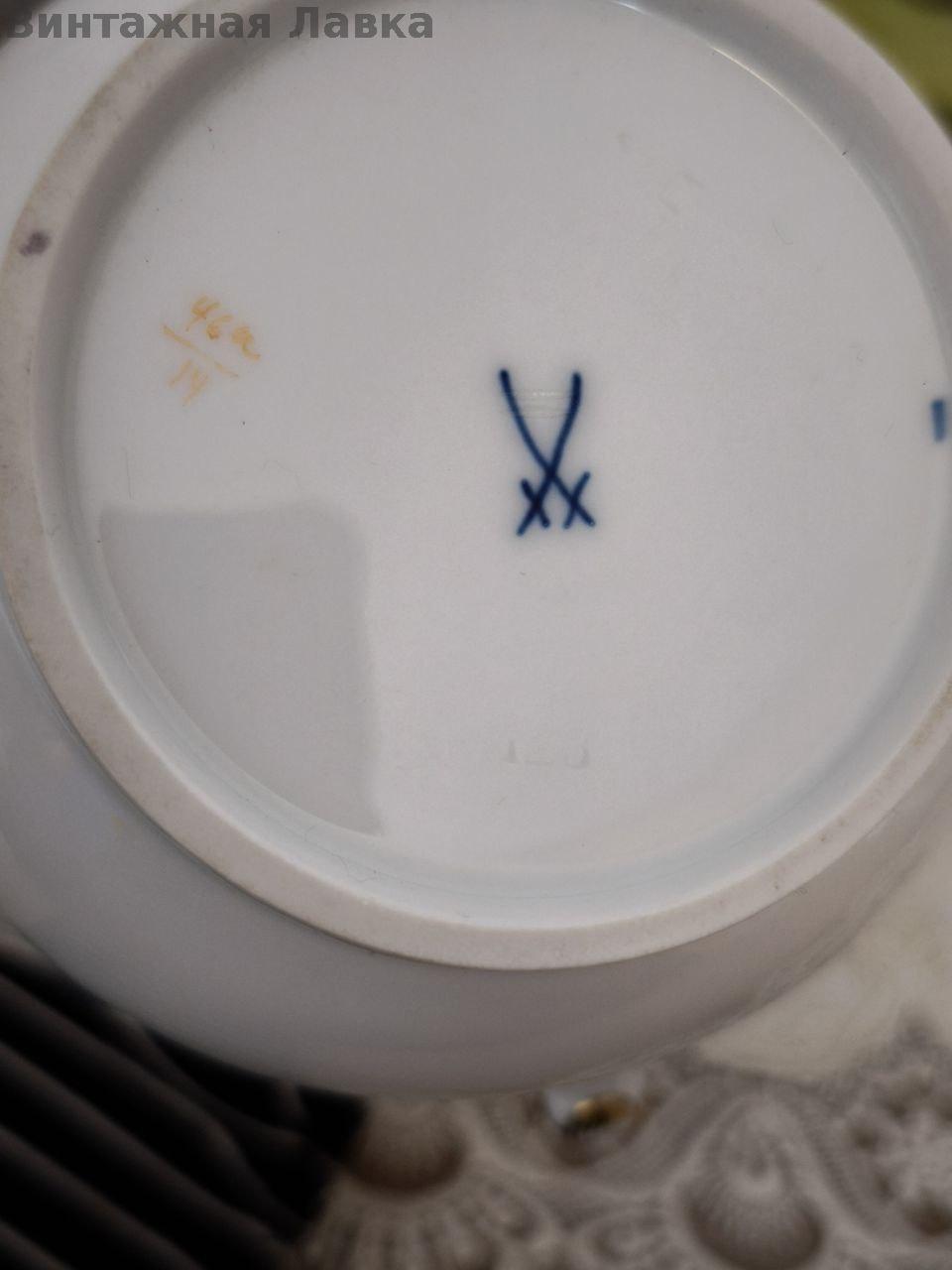 На дне — подглазурное клеймо скрещённые мечи, подтверждающее производство мануфактуры Meissen.