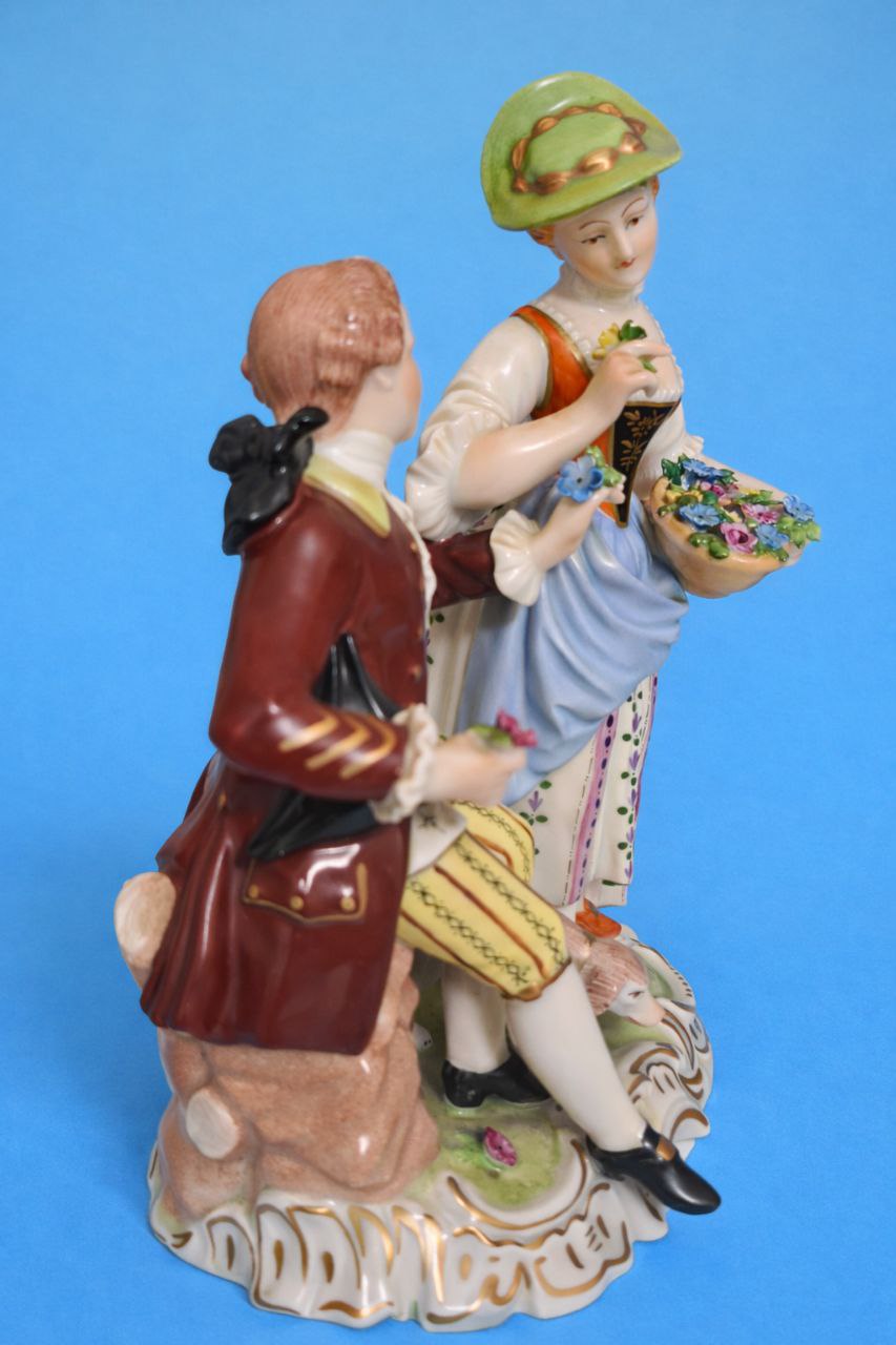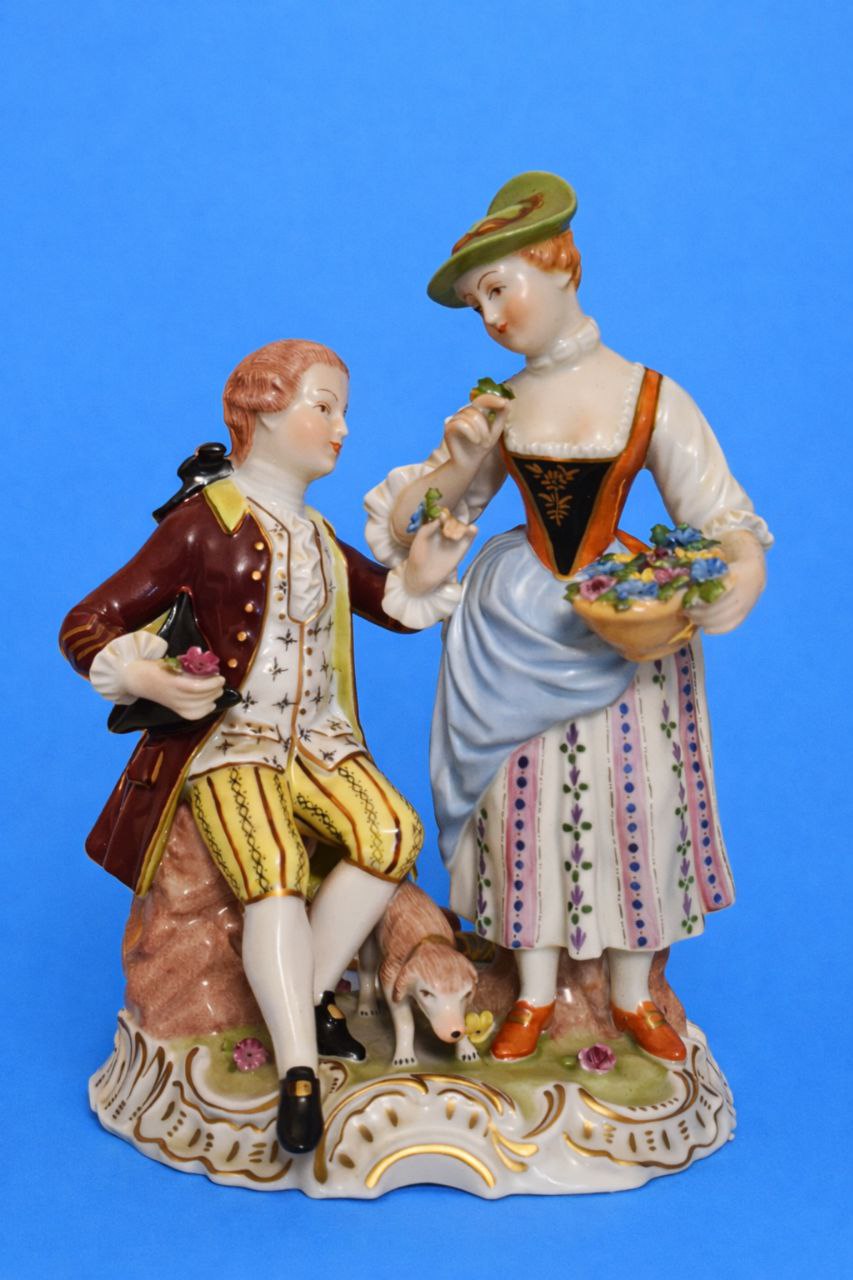 Изящная композиция в стиле рококо: кавалер сидит на камне и протягивает цветок молодой девушке с корзиной цветов. У ног фигур — маленькая собачка.