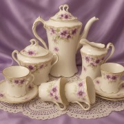Белоснежный фарфор с изображением душистого горошка в розово-лиловых тонах.