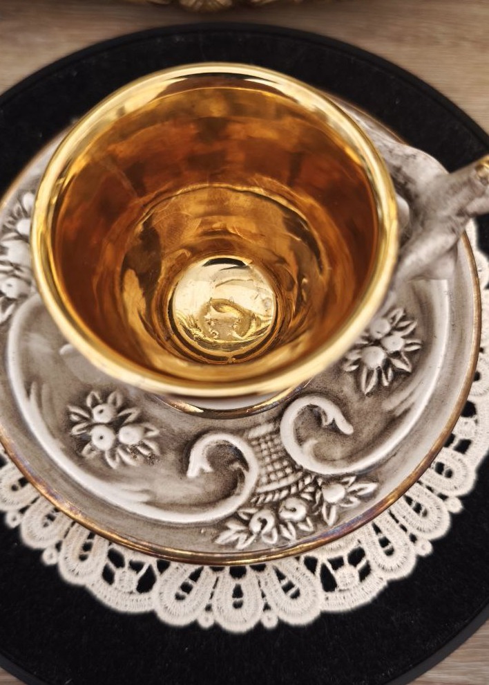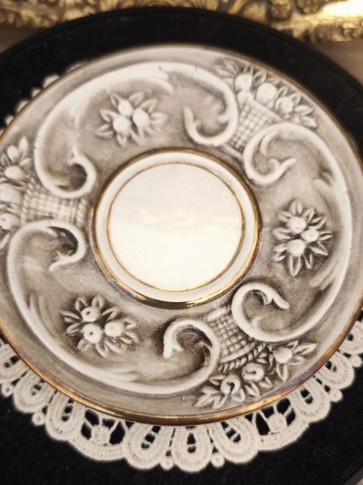 – Блюдце с рельефными цветочными и орнаментальными деталями, обрамлёнными позолотой.