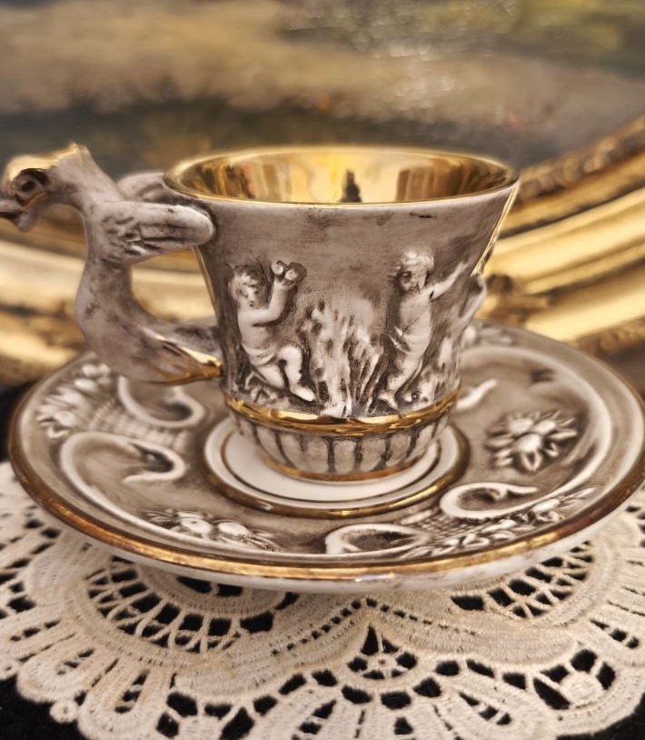 – Чашка украшена фигурками амуров/путти в орнаментальной композиции.