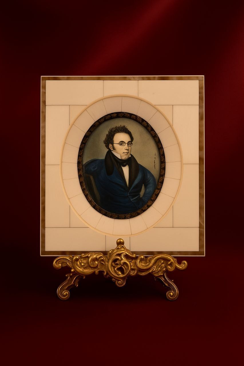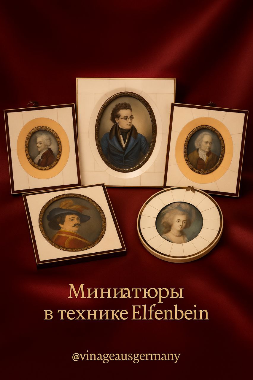 Миниатюра в технике Elfenbeinmalerei — ручная роспись по тонкой пластине слоновой кости.