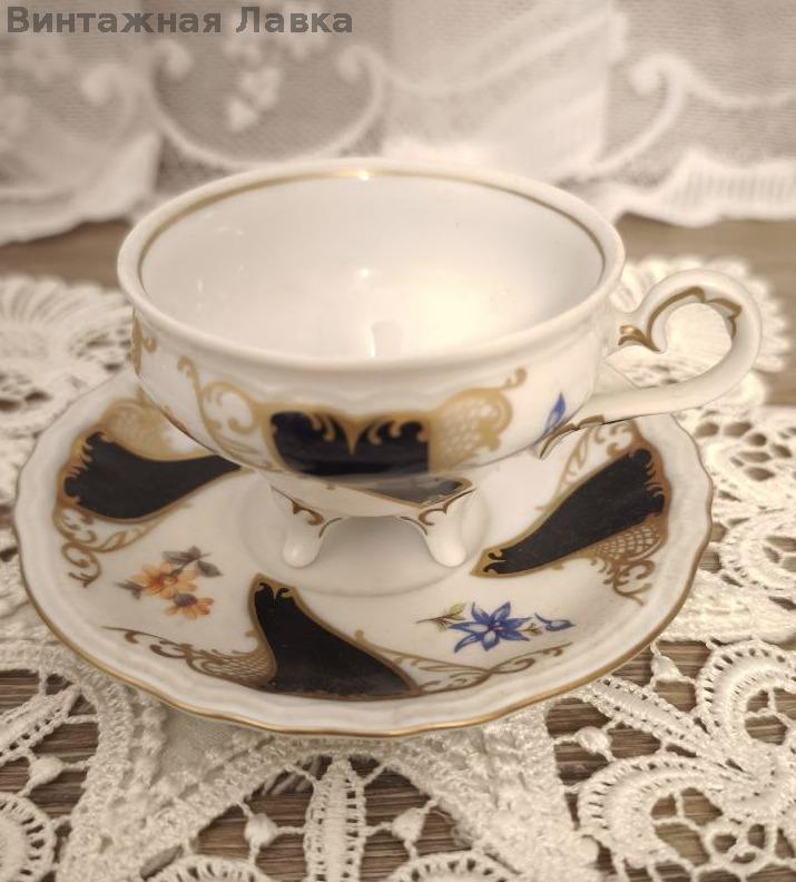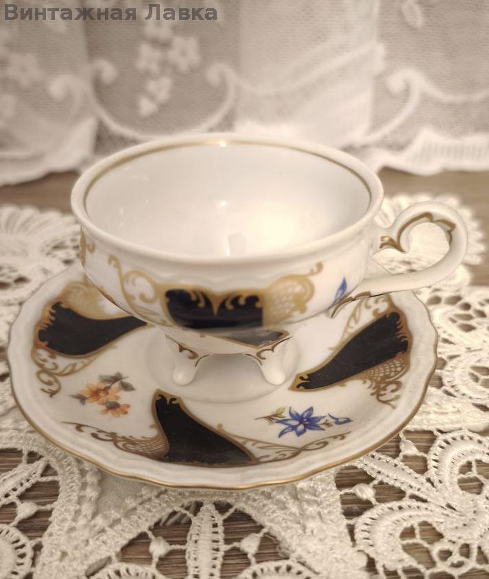 Элегантный фарфоровый дуэт с выразительными кобальтовыми вставками, украшенными тонким золотым орнаментом. На белом поле — аккуратная ручная роспись небольших цветочных мотивов. Чашка выполнена в редкой форме на трёх миниатюрных ножках, с фигурной ручкой и мягким волнистым краем.