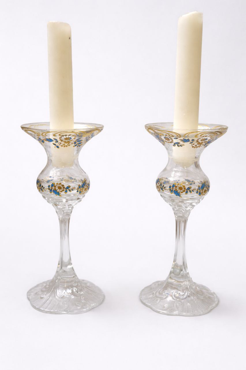 Изящные стеклянные подсвечники с характерным для серии «Sanssouci» утончённым силуэтом и деликатным орнаментом в золоте с голубыми акцентами.