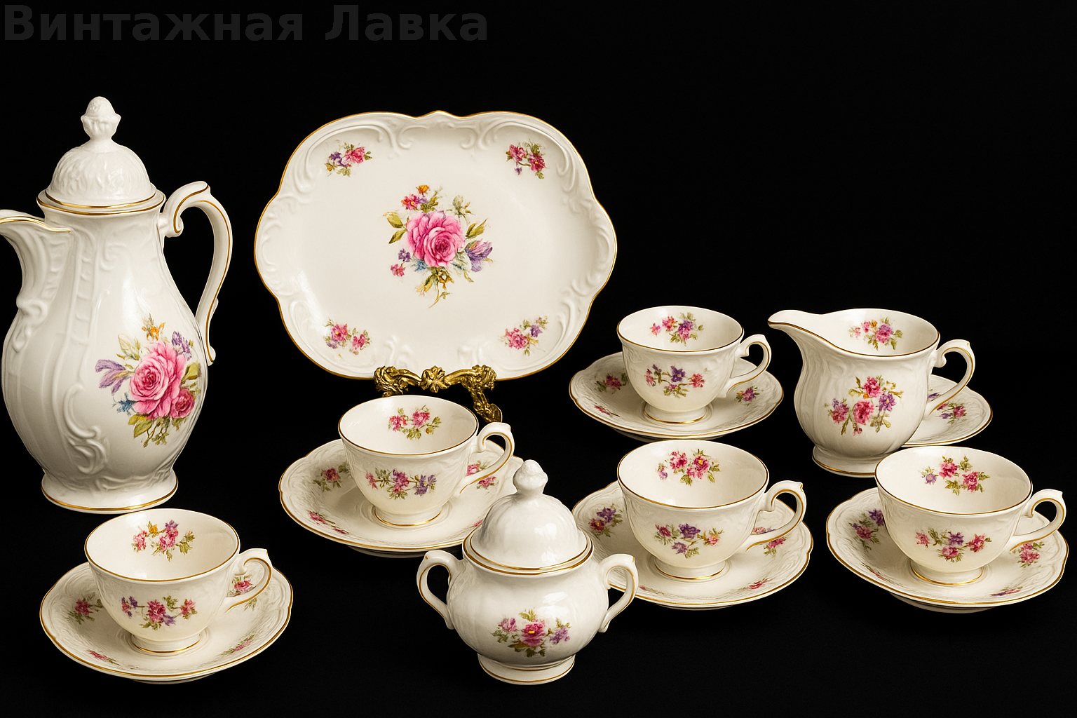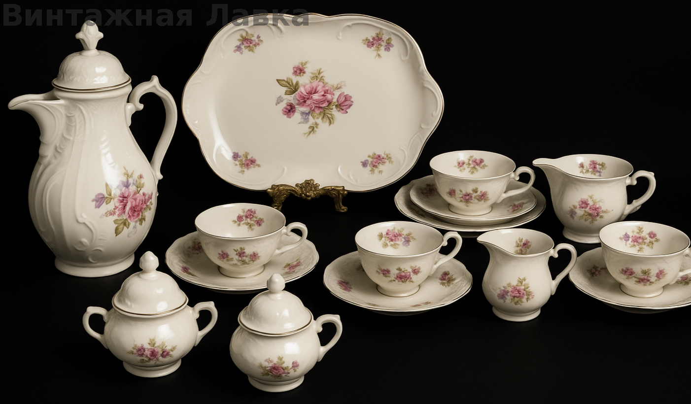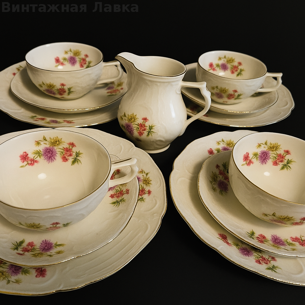 Классический немецкий фарфоровый сервиз в знаменитой форме Sanssouci — визитной карточке Rosenthal. Изящный рельеф с мягкими волнами, тёплый оттенок айвори и нежный цветочный декор создают ощущение уюта, покоя и благородной классики.