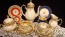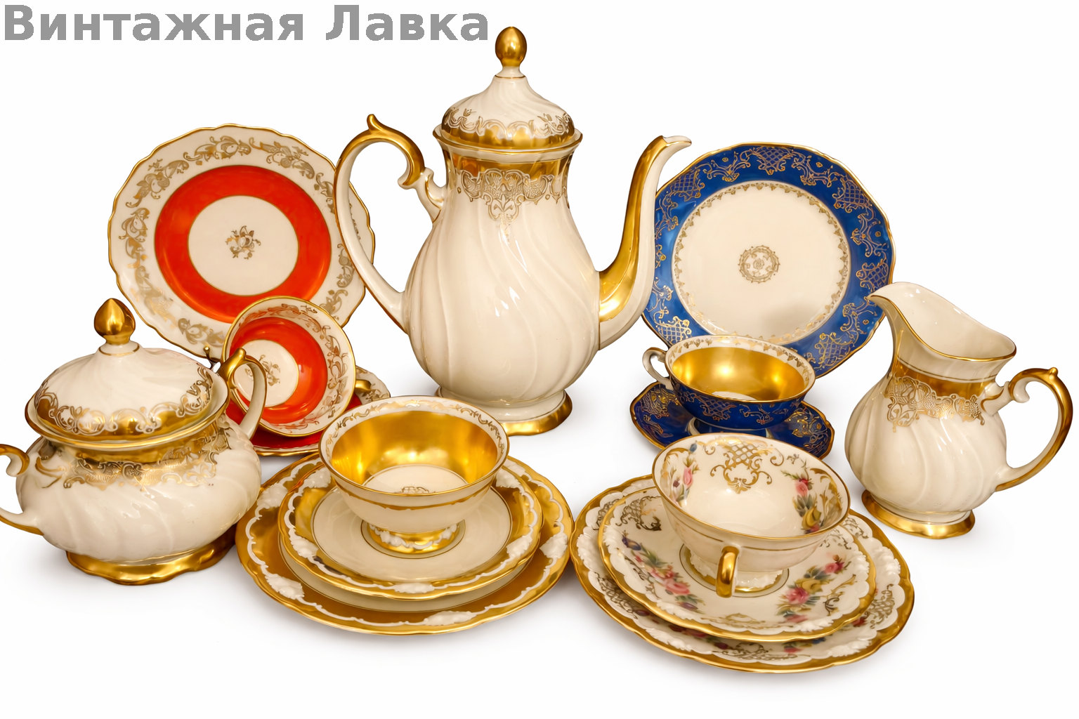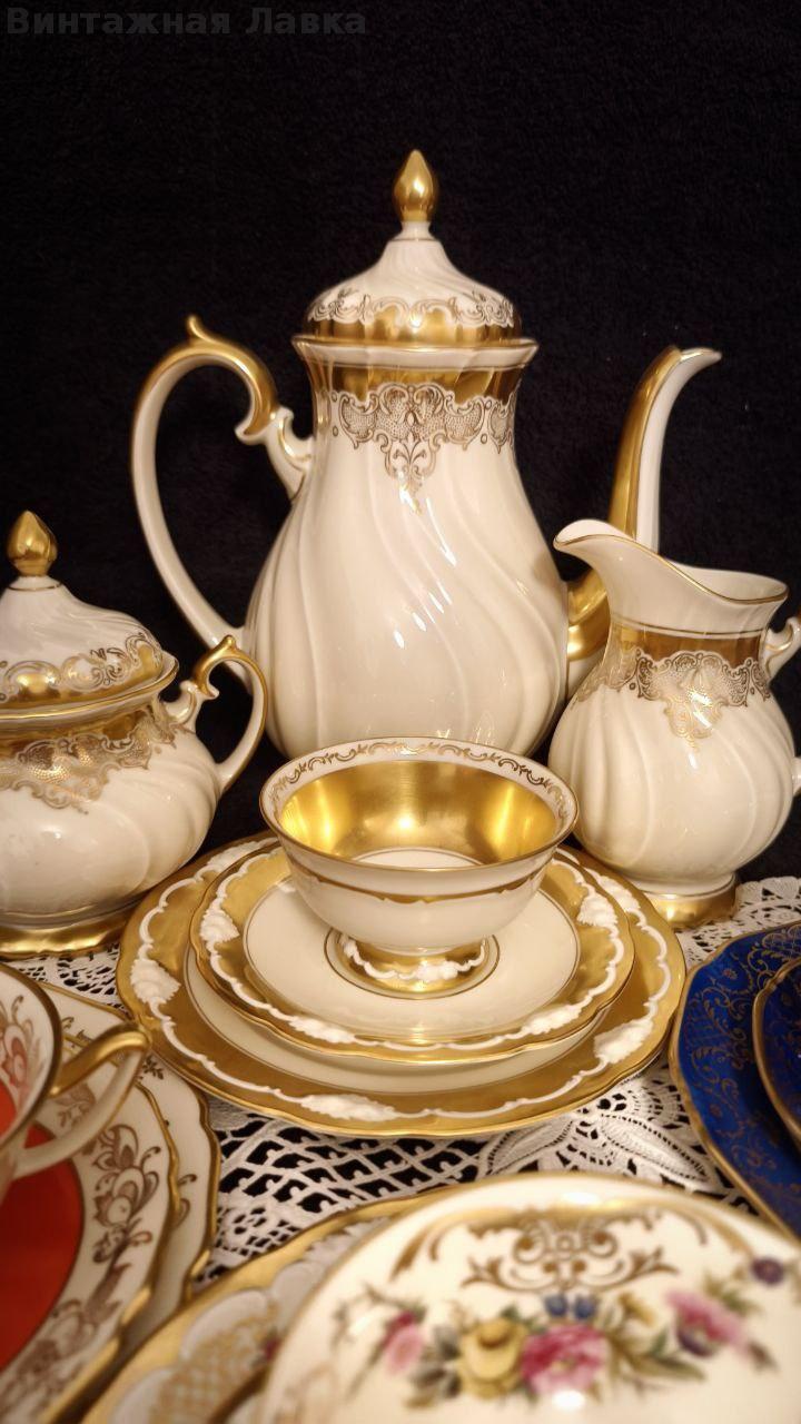 Фарфоровый сет состоит из чайника, сахарницы, кофейника и четырех трио.