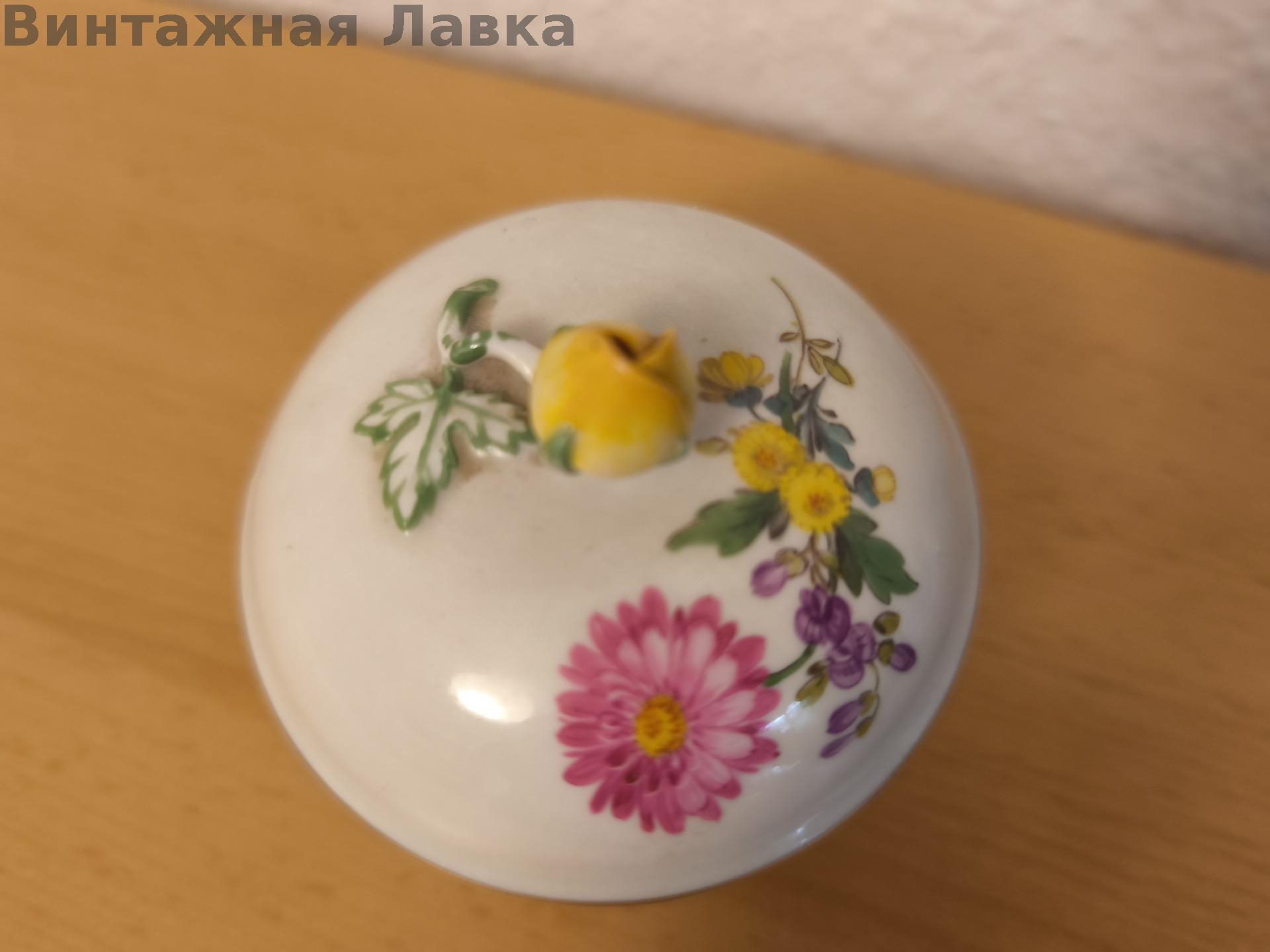 Крышка украшена характерной для Meissen бутонной ручкой.