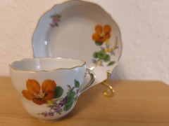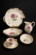 На корпусе изображены изящные цветочные композиции в пурпурных, розовых и зелёных тонах, характерные для классической мейсенской традиции цветочной живописи.